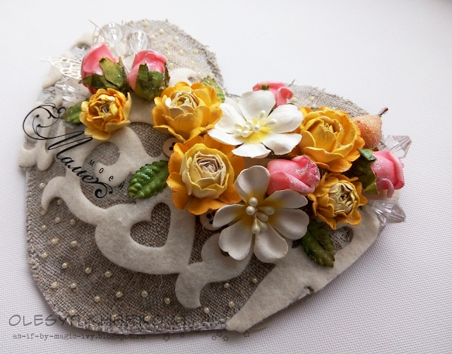 Для цветочной композиции выбрала желтые плоские цветы Прима и скрутила из них розочки, так же взяла розовые цветы из фоамирана. Добавила по мелочи: палочки с кристаллами на конце, засахаренную грушу от Scrapberry's, пуговки и расшила сердечко бисером цвета слоновой кости.