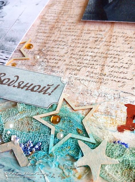 Мне выдалась возможность от нашего Мемуариса протестировать бумагу Фабрика Декора Морская роматика ( так кажется называется). Мне понравились принты, такие размытые, акварельные, совершенно неяркие. Для моих целей самое то, целью было сделать страничку со старыми фотографиями дедушки. Однако, для микст-медиа эта бумага не очень подходит, бумагу очень ведет от спреев и паст. Тем не менее, мне удалось ее чуть-чуть обуздать )