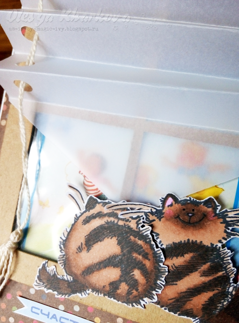 У котеек не просто окно, оно еще и со "стеклом") из пластика. За окном вставила карточку с детишками, которые запускают воздушного змея. Один кот очень внимательно следит за этим, второй на что-то отозвался)) Раскрасила маркерами Chameleon.